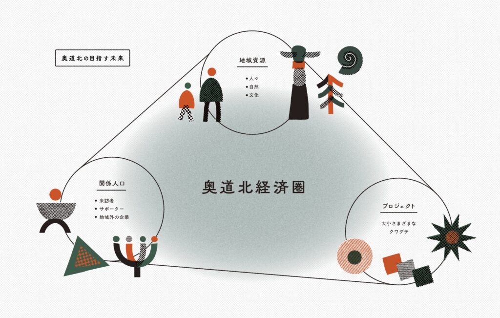 ”奥道北” は単なる呼称でもなく、一過性のキャンペーンでもなく、ひとびとの暮らしやそれを下支えする経済活動など、確かな営みを具現化していく姿勢をひとつの図に表しました。